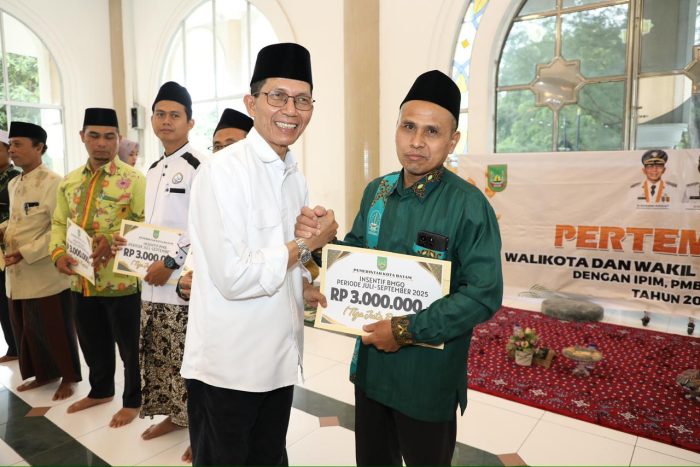 MeutiaraNews.co – Wali Kota Batam Amsakar Achmad, menyerahkan secara simbolis insentif bagi tokoh agama yang tergabung dalam Ikatan Persaudaraan Imam Masjid (IPIM), Persatuan Mubaligh Batam (PMB), dan Badan Musyawarah Guru Al-Qur’an (BMGQ) periode III tahun 2025.