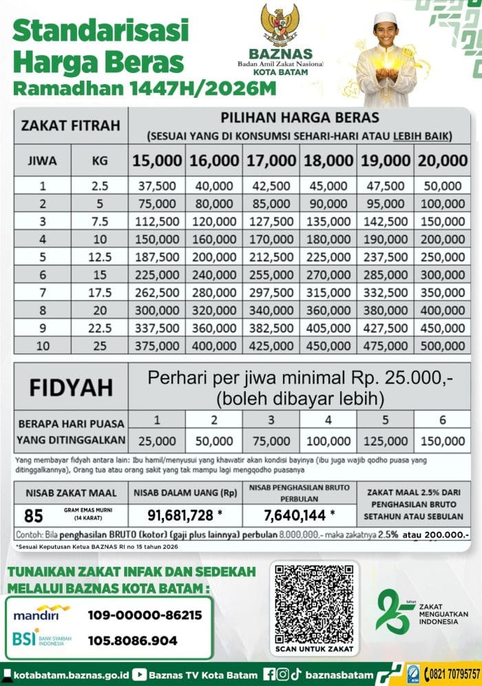MeutiaraNews.co – Badan Amil Zakat Nasional (Baznas) Kota Batam resmi menetapkan standarisasi harga beras untuk pembayaran zakat fitrah pada Ramadhan 1447 Hijriah/2026 Masehi. Penetapan ini dilakukan sebagai pedoman resmi bagi masyarakat dalam menunaikan kewajiban zakat fitrah sesuai dengan jenis dan kualitas beras yang dikonsumsi sehari-hari.