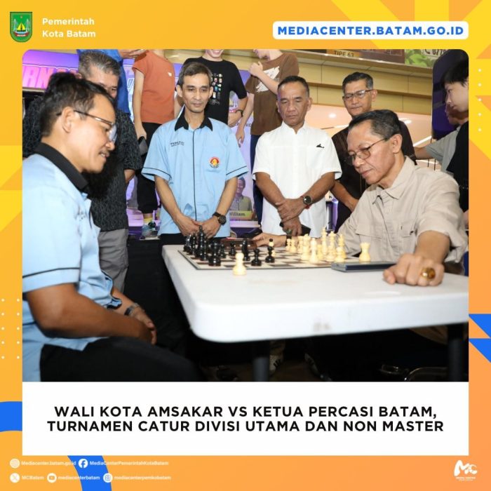 MeutiaraNews.co – Wali Kota Batam, Amsakar Achmad berhadapan langsung dengan Ketua Persatuan Catur Seluruh Indonesia (Percasi) Batam, Suhandri saat pembukaan Turnamen Catur Divisi Utama dan Non Master Percasi Kota Batam di MB2 Mall, Sabtu (28/6/2025).