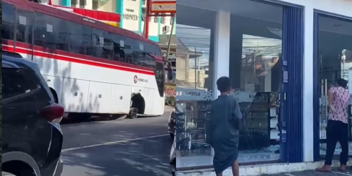 Saat itu, ban bus tersebut meluncur deras sampai menghantam kaca bangunan apotek yang berada tepat di kawasan pertigaan.