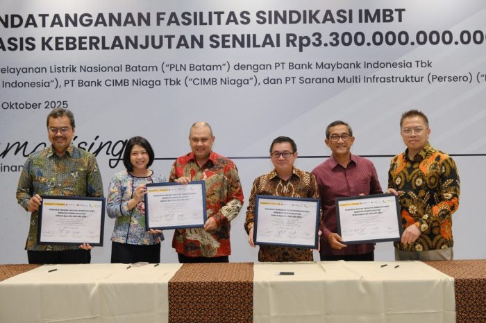 MeutiaraNews.co – PT PLN Batam resmi menandatangani Perjanjian Fasilitas Sindikasi Pembiayaan berdasarkan prinsip Ijarah Muntahiyah Bittamlik (IMBT) bersama PT Bank Maybank Indonesia Tbk, PT Bank CIMB Niaga Tbk, dan PT Sarana Multi Infrastruktur (Persero).