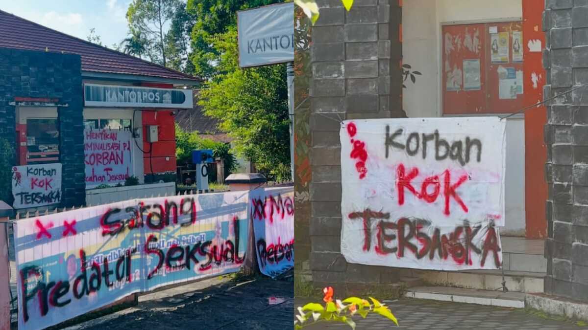 Beberapa tulisan yang ada kain tersebut seperti, “Hentikan kriminalisasi pada korban pelecehan seksual,” “Korban kok tersangka,” “Pecat pelaku! Keadilan untuk korban,” dan lainnya.